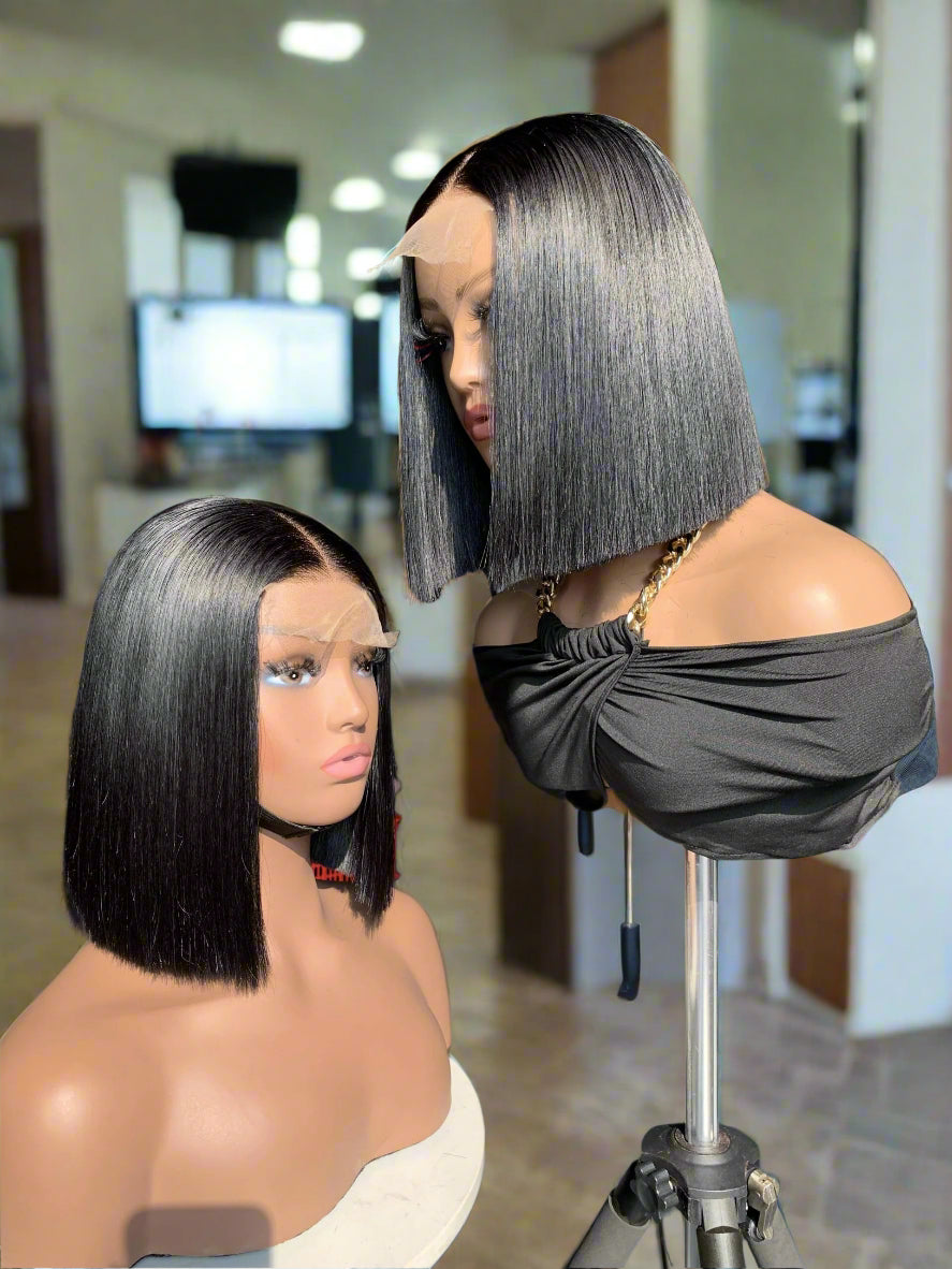 Sleek, bold, and effortlessly chic—Ashleigh is the ultimate bone straight blunt cut wig, crafted from super double drawn Remy Vietnamese human hair for unmatched thickness from root to tip. This dyed jet black 10-inch unit features a sharp, precision-cut blunt bob style, making it the perfect balance of modern sophistication and edgy glam.